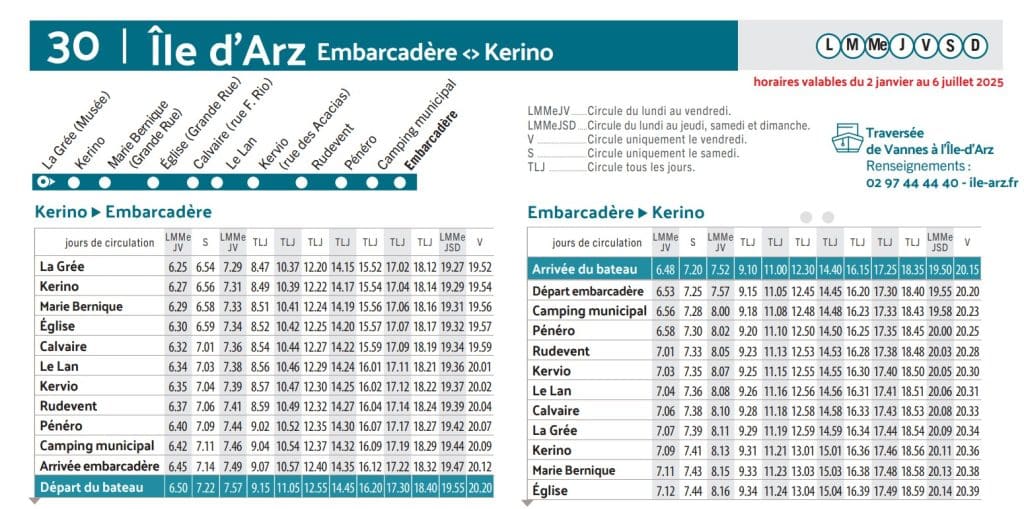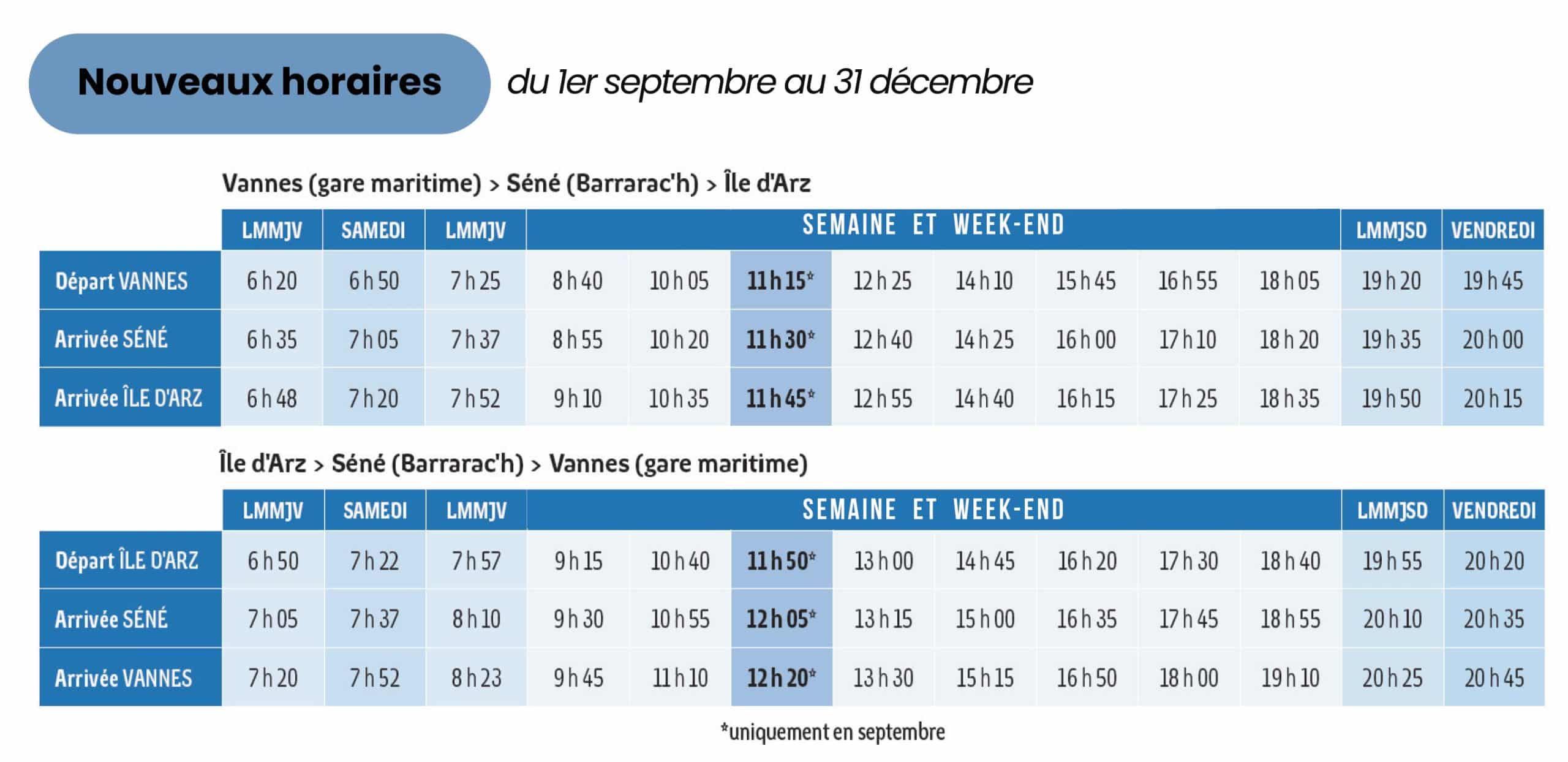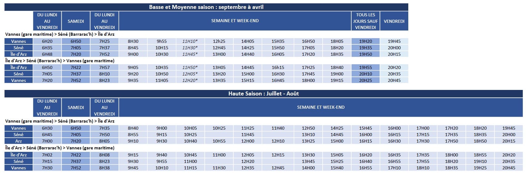07H30, 08H30 10H00, 11H30 – 14H30 et 15H30 Départ île d’Arz