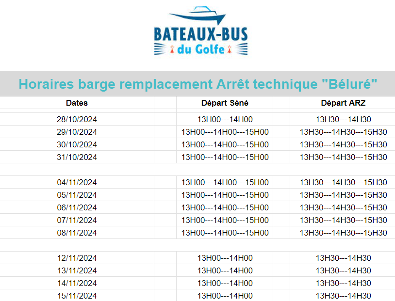 La compagnie Bateaux bus du Golfe nous informe que durant l’arrêt technique de la barge Béluré, le service marchandise sera assuré par la barge de remplacement sur les dates et horaires figurants sur le tableau ci-dessous.